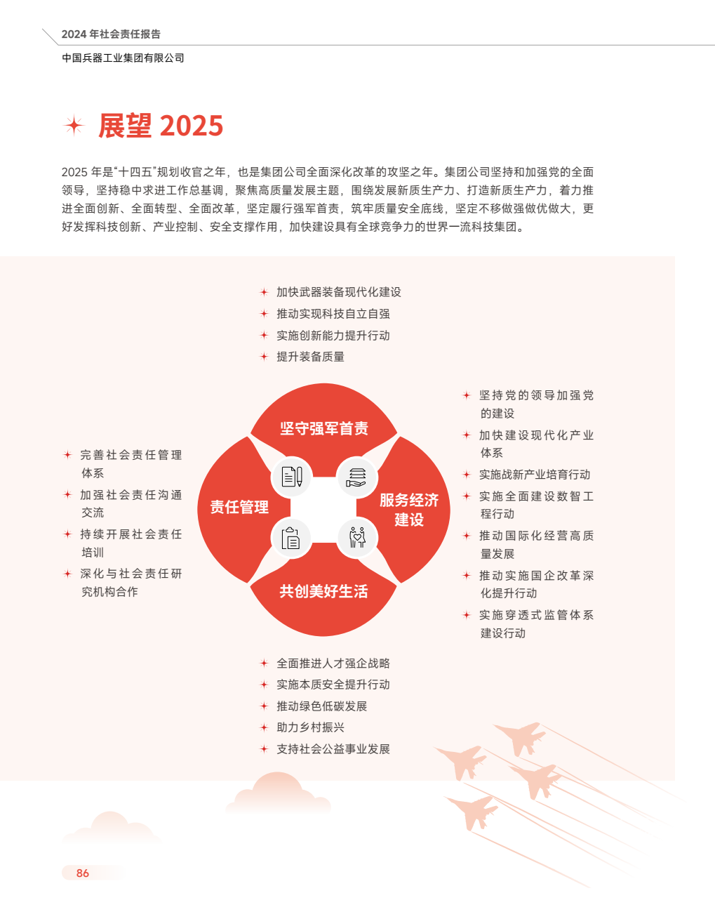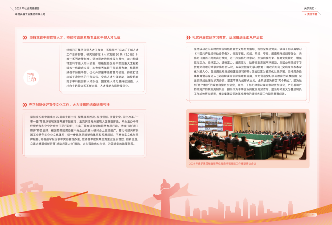 近日,中國兵器工業(yè)集團(tuán)有限公司正式發(fā)布《中國兵器工業(yè)集團(tuán)有限公司2024年度社會責(zé)任報(bào)告》。本次報(bào)告是集團(tuán)公司第16份年度社會責(zé)任報(bào)告,從堅(jiān)守強(qiáng)軍首責(zé)、服務(wù)經(jīng)濟(jì)建設(shè)、共創(chuàng)美好生活三個維度,全面展示集團(tuán)公司履行社會責(zé)任的實(shí)踐與成效。經(jīng)中國企業(yè)社會責(zé)任報(bào)告評級專家委員會評定,《報(bào)告》獲得“五星佳”最高評級,成為軍工行業(yè)唯一一家連續(xù)6年獲此殊榮的中央企業(yè)。 兵器工業(yè)集團(tuán)2024年度社會責(zé)任報(bào)告 部分內(nèi)容摘錄 ↓↓↓ 文/社會責(zé)任部 |